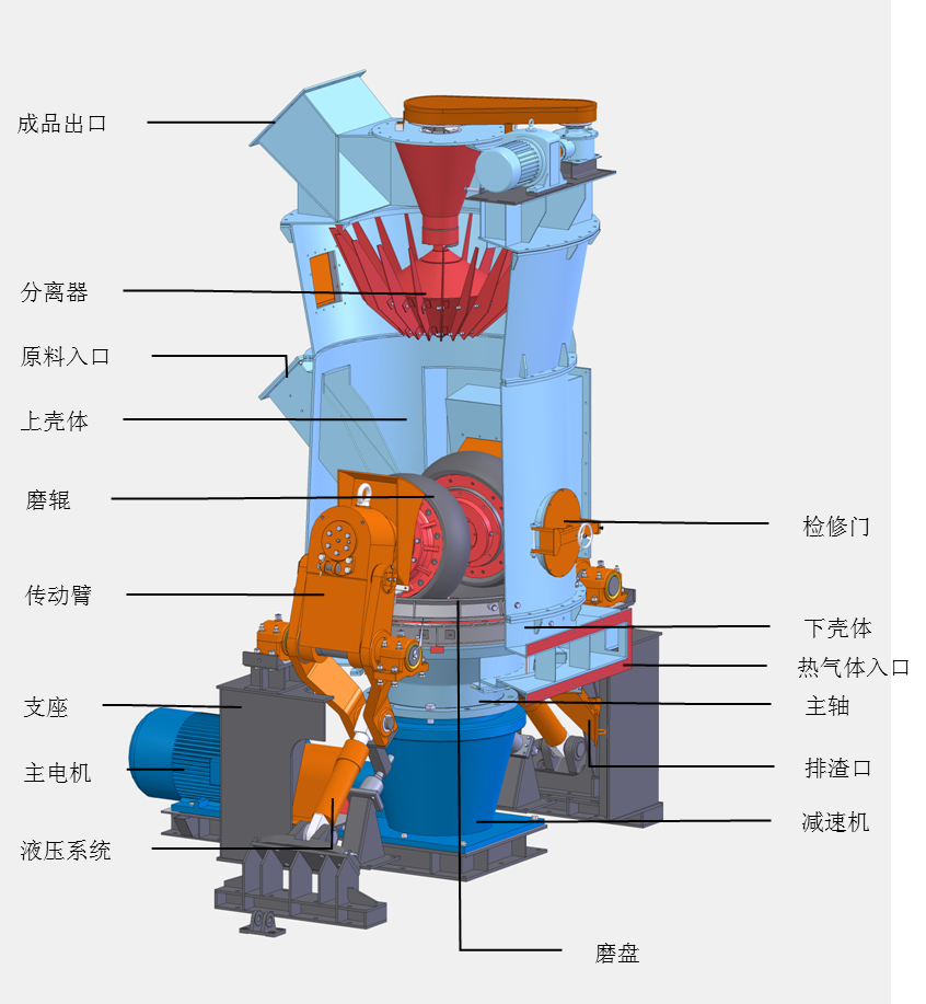 3、烘干能力強(qiáng),利用輔助熱源可烘干粉磨水分高達(dá)12%-15%的物料;
